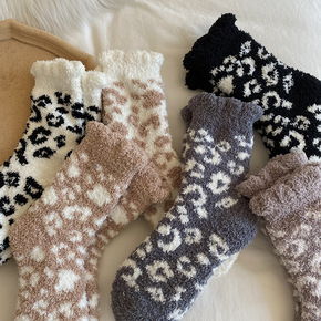 袜子女中筒袜加厚保暖珊瑚绒长袜豹纹日系居家地板袜可...