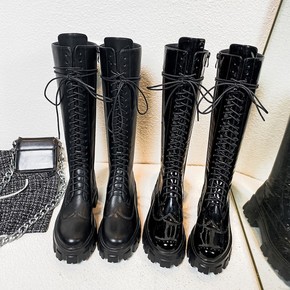 欧美复古厚底绑带布洛克雕花日韩系原宿不过膝长靴绑带...