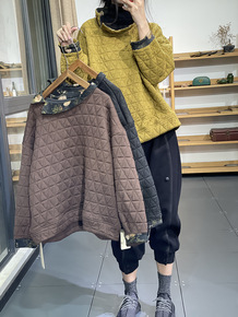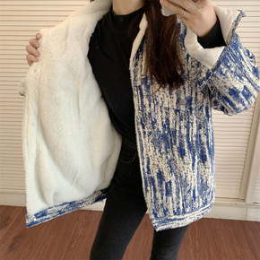 秋冬大码时尚潮流bf风加绒加厚个性印花翻领宽松菱格...