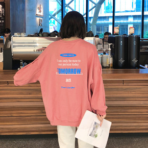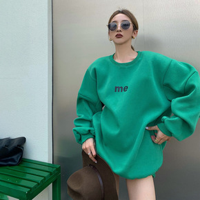 原宿字母印花长袖卫衣加绒女慵懒外穿港风中长款纯棉上...