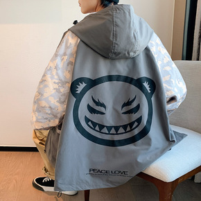 拼接撞色夹克男秋季潮流高街拼接港风印花带帽宽松原宿...