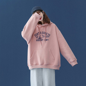 刺绣爱心连帽加绒卫衣女韩版宽松BF风日系甜美粉色原...