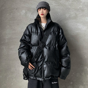 2021冬新款原宿黑色PU皮棉衣女宽松bf风加厚棉...