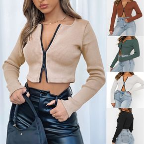 亚马逊秋冬跨境女装纯色拉链长袖露脐上衣性感修身抓绒...