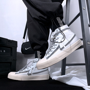 新款白色高帮帆布鞋男韩版百搭潮流反光ins港风街拍...