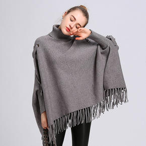 1203#欧美秋冬新款 高领蝙蝠袖流苏套头针织衫斗...