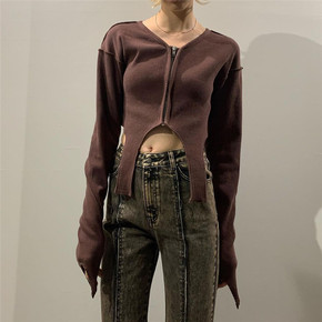 欧美INS街头不规则V领拉链针织上衣开衫秋冬季纯色...