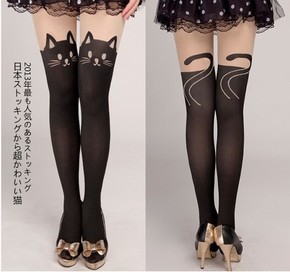 日系原单新款原宿假高筒可爱猫咪连裤袜丝袜 猫头猫尾...
