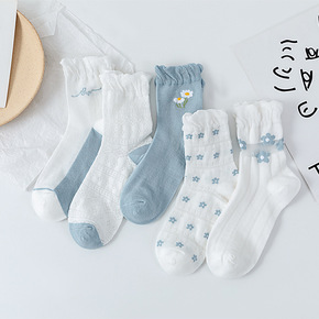 五双装日系森女原宿风搭可爱小花蓝色泡泡口纱袜蕾丝花...