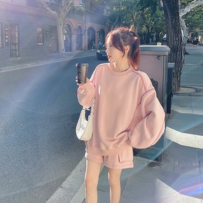 粉色卫衣短裤套装女秋季2021新款港风chic复古...