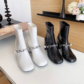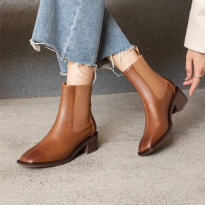高端品质2021真皮秋冬弹力女靴百搭方头中跟粗跟链...