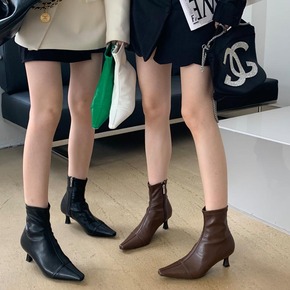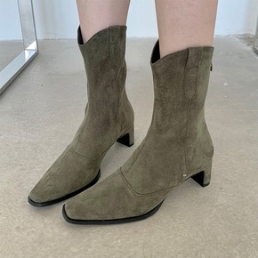 方头粗跟短靴女2022春秋单靴高跟弹力靴子性感及踝...