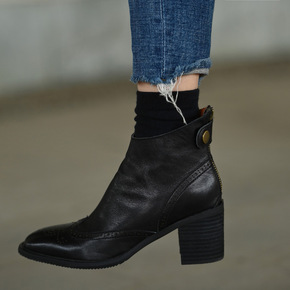 雅诗朗法式复古黑色牛皮短靴女冬加绒高跟粗跟及踝靴后...