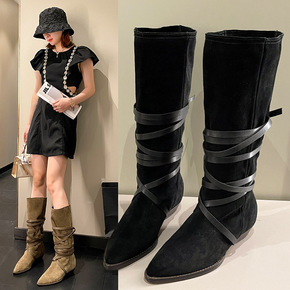 切尔西靴2022秋冬新款欧美潮流绑带靴中跟裸靴时尚...