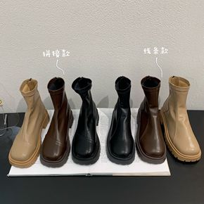 2022新款靴子女式短筒踝靴弹力布方头套脚皮质靴子...