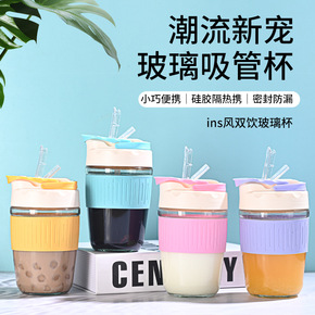 玻璃双饮杯便携创意双层女咖啡杯随手杯礼品吸管学生玻...