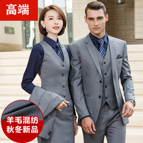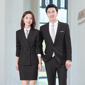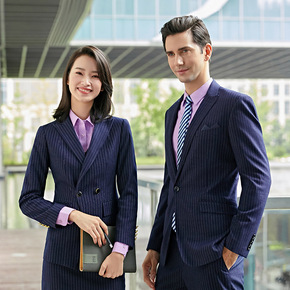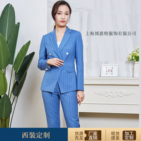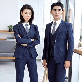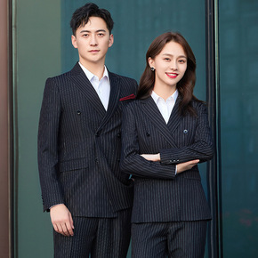 条纹西装套装工作服男女同款高端商务工作服公司工装白...