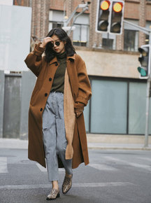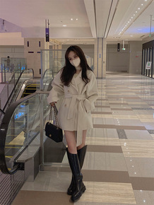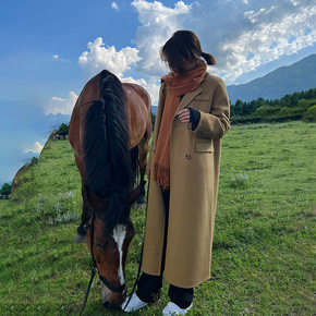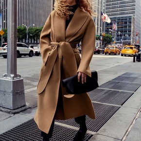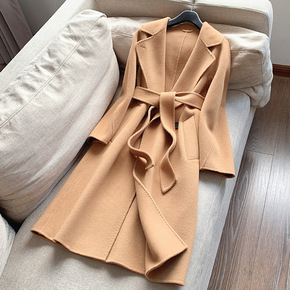 北欧风Tote女装新款驼色腰带款双面呢大衣中长款毛...