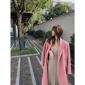 安娜同款秋冬仙女少女粉纯色西装腰带中长款双面呢羊绒...