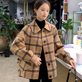 反季双面毛呢大衣女韩版千鸟格立领短款修身小个子毛呢...