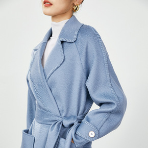 手缝秋冬季手工双面羊毛大衣 荷叶领系带中长款宽松羊...