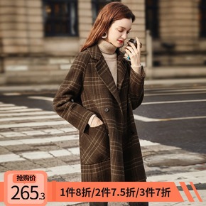 秋冬新款手工正宗双面羊绒格子大衣韩版宽松中长款复古...