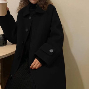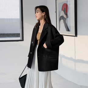 赫本风黑色双面羊绒大衣女常规西装款小个子大口袋羊毛...