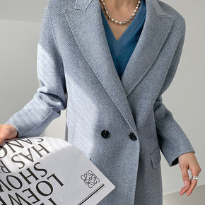 简极人字纹中长款西装领双面羊绒大衣毛呢外套女韩版2...