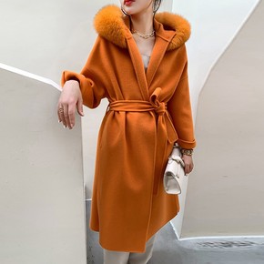 2021新款高端狐狸毛领连帽双面羊绒大衣女中长款 ...