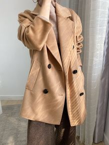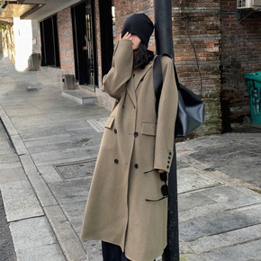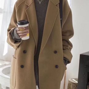 2021年水波纹羊绒大衣女中长款宽松双排扣纯色羊毛...