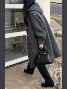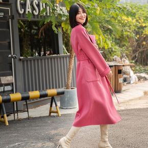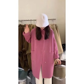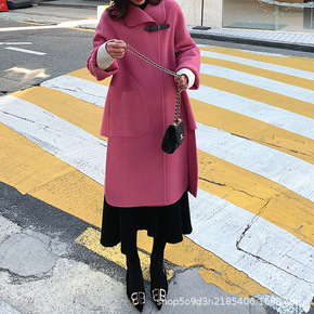 韩国东大门树莓粉玫红色连帽中长款小个子双面呢子羊绒...