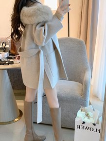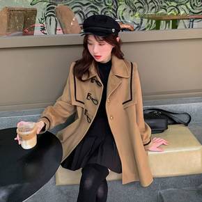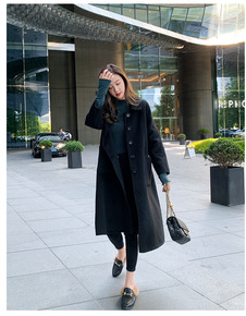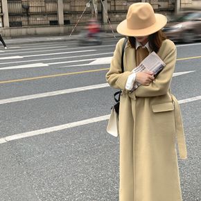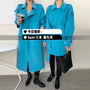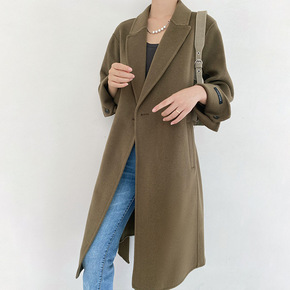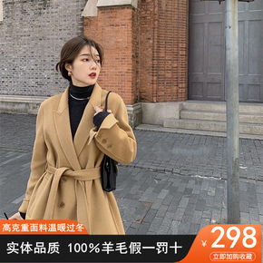 新款韩版秋冬毛呢外套女长款西服领系带气质通勤双面手...
