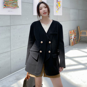 秋冬季新款女羊毛呢外套直筒型韩版西装领无腰纯色双面...