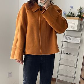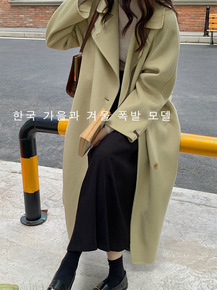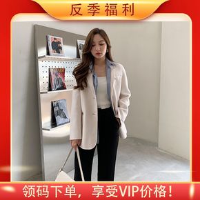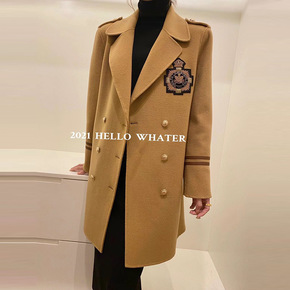 现货21冬韩国新款手缝双面羊绒大衣短款西装领青驼格...