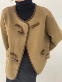 欧洲站2021秋冬牛角扣圆领长袖拼皮包边双面羊绒羊...