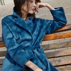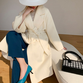 潮ins高级水波纹中长款西装领系带双面羊绒大衣毛呢...