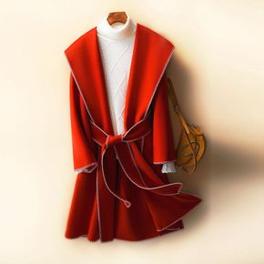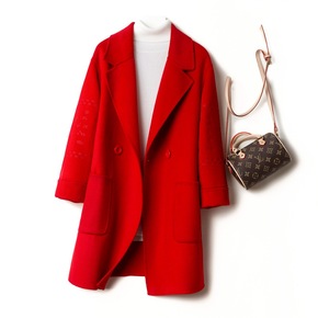 小个子羊羔毛红色双面羊绒大衣女中长款2021秋冬新...