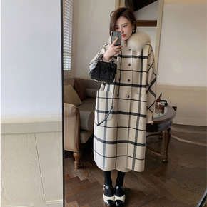 高级感毛领大衣外套格纹双面羊绒大衣女2022年冬季...