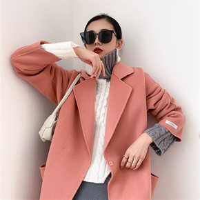 新韩版翻领毛呢外套女 高定粉色减龄温柔中长款双面羊...