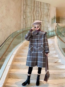 双面羊绒大衣女新款赫本风牛角扣中长款格子毛呢外套潮...