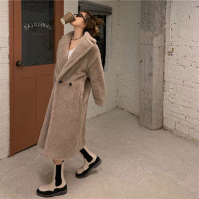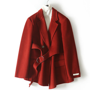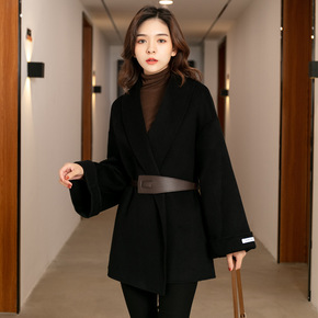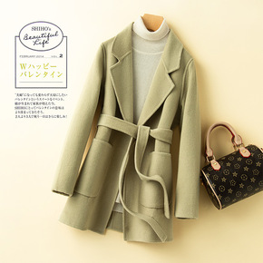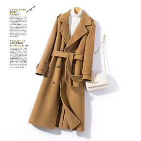 2021新款双面毛呢大衣外套女韩版宽松中长款腰带羊...