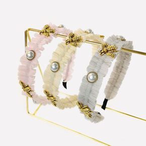 小蜜蜂珍珠发箍洗脸发带雪纺褶皱发卡欧根纱头扣可爱公...