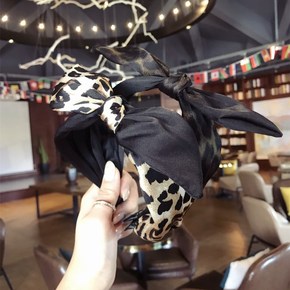 韩国新款多色豹纹撞色蝴蝶结兔耳朵宽边发箍头箍压发束...