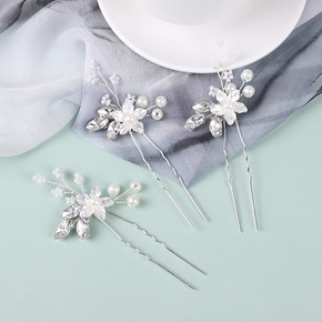跨境货源新娘盘发叉插针u型夹 镶钻花朵发钗簪子头饰...