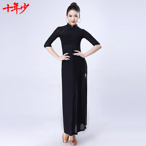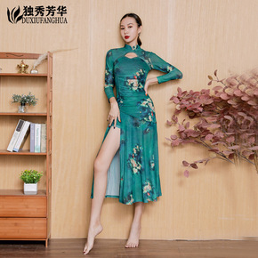 古典舞韵纱衣改良旗袍长袖高开叉连衣裙镂空性感演出服...