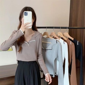 2022秋季新款polo领针织时尚简约撞色宽松长袖...
