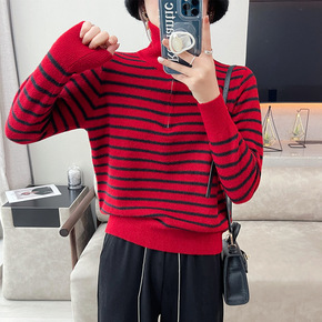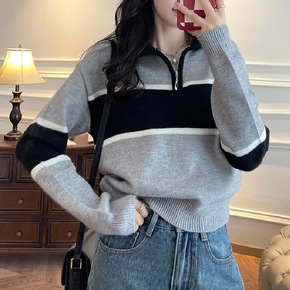 POLO领韩版减龄显瘦半拉链拼色条纹毛衣女秋冬套头...