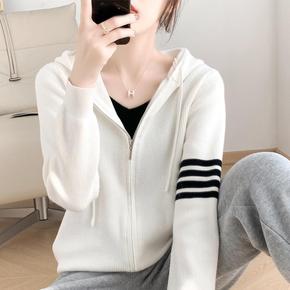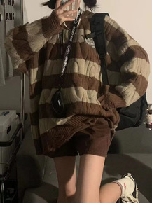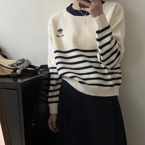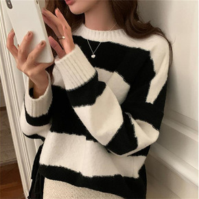 慵懒风套头撞色条纹毛衣女2022新款秋冬季套头宽松...
