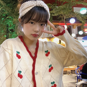 2022秋冬季新款韩系文艺少女可爱樱桃小刺绣花边针...