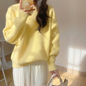 早秋新款软糯奶黄色套头毛衣女韩版宽松套头坑条针织衫...